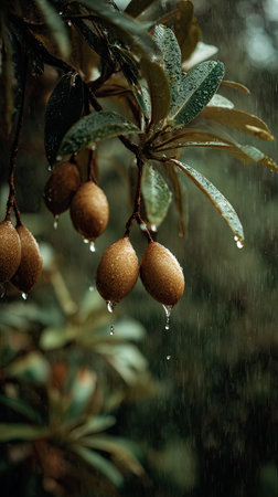Soft rain falling gently on Sapodilla, with water droplets forming and slowly dripping. The background is softly blurred with natural, moody atmosphere.
