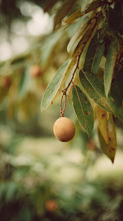 An unripe sapodilla fruit growing on a tree branch, capturing the promise of sweet harvests and the beauty of nature's growth cycle.