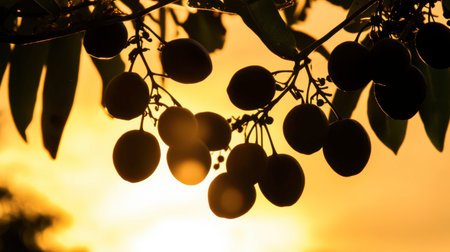 A striking silhouette of juicy fruits hanging on branches, beautifully contrasted against a warm sunset. Ideal for nature-themed projects and fresh food scenes.