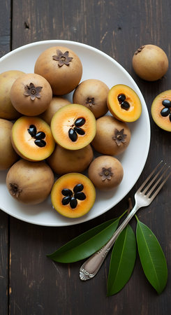Sapodilla fruits kitchen. Wooden bowl with unusual and nutritious food. Generate AI