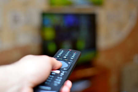 Changing TV program: close up of human hand holding television remote control on blurred background with TV screen