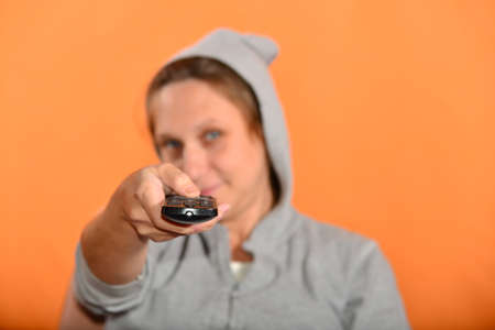 The girl the girl in the hood looks at the remote and switches the channels on TV.