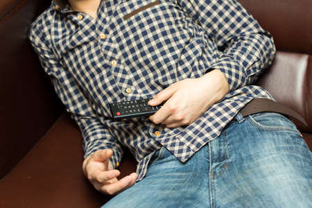 A man holds in his hand TV remote control. The man switches channels, choosing what to watch. Recreation and entertainment concept