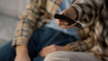 Closeup hand zapping tv resting at home. Man watching television on sofa alone. Unrecognized person holding remote control changing channels in living room. Unknown guy relaxing enjoy weekend programs