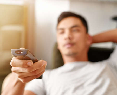Seeking the sports channel. Shot of a young man using a remote control to change the channel on his television while he lies on the couch.