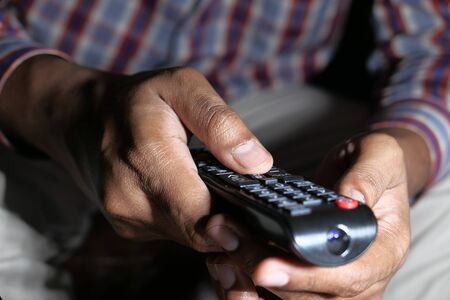 Wireless electronic devices. Closeup of remote control in male hand. Man switching program.