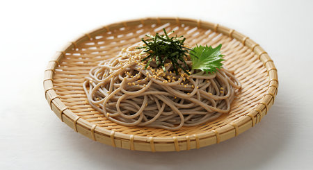 Japanese buckwheat noodles in a bamboo sieve on a white background