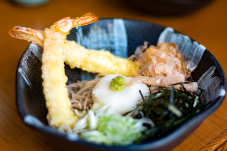 Soba noodle with fried fish for lunch at local restaurant in Kyoto, Japan.