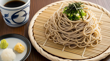 Traditional Japanese meal with cold soba noodles on a sieve bamboo tray