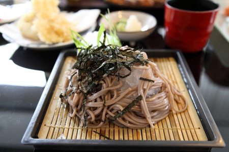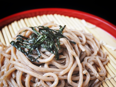 Hanamaki soba, buckwheat noodles topped with nori (dried edible seaweed) and wasabi. Japanese traditional food.