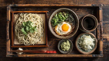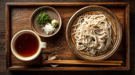 A top-down view of freshly prepared soba noodles displayed elegantly on a wooden tray with aromatic toppings and dipping sauce, showcasing Japanese culinary artistry.