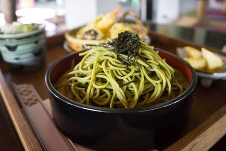 Japanese Cha Soba (Green tea Soba) in dish - Selective focus point