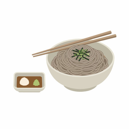 A bowl of traditional Japanese cold soba noodles, or zaru soba, served with tsuyu dipping sauce, wasabi, and chopsticks. Isolated vector illustration on a white background.