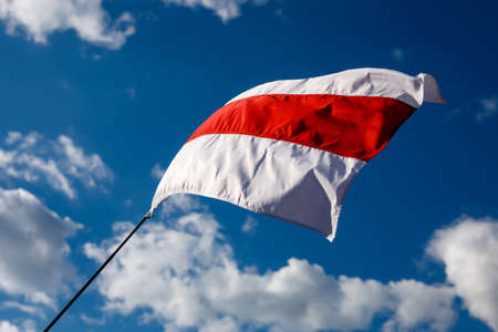 White-red-white flag on blue sky background. Historical Belarus authentic flag.
