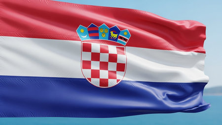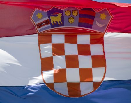 the Croatian flag waving against a clear blue sky. The flag features red, white, and blue horizontal stripes with a checkered shield bearing the national coat of arms, symbolizing Croatias heritage and pride.