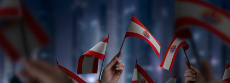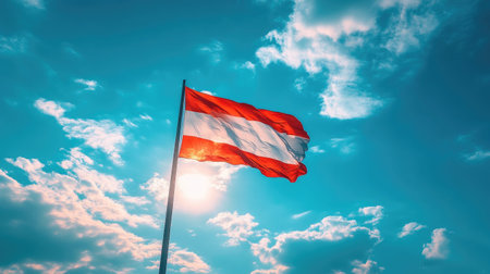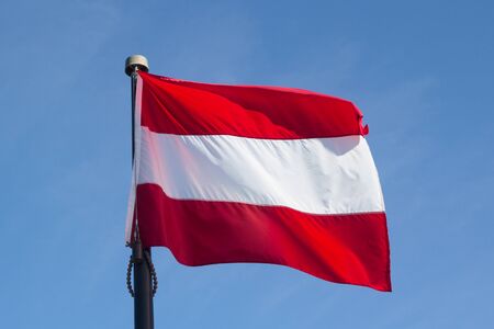 The red-white-red flag of Austria is flying in the sky. The Austrian flag hangs on a flagpole and flutters in the wind against the blue sky. Immigration. Travel and tourism.
