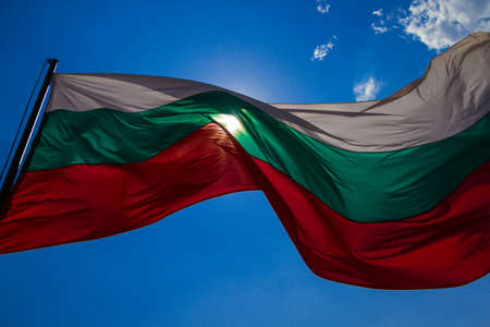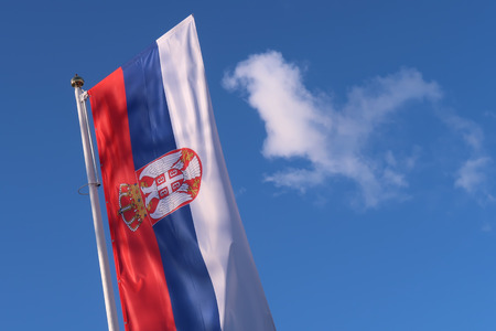 The flag of serbia against the blue sky flutters in the wind. Flag of a country in Europe..
