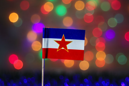 The historical Yugoslav flag with red star set against a vibrant bokeh background. Highlighting Balkan history, communist heritage, and retro themes. Great for educational media.