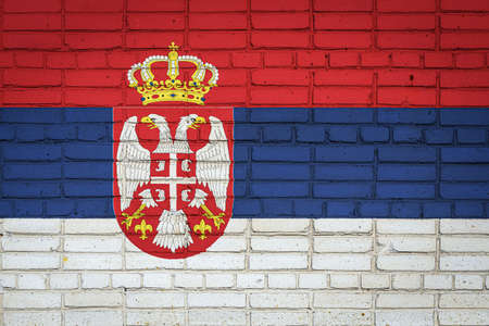 National flag of Serbia depicting in paint colors on an old brick wall. Flag banner on brick wall background.