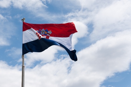 the croatian flag blowing in the wind against a beautiful blue sky with clouds