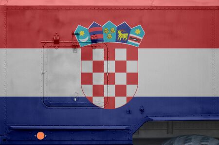 Croatia flag depicted on side part of military armored truck close up. Army forces vehicle conceptual background
