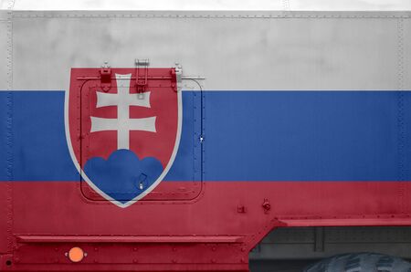 Slovakia flag depicted on side part of military armored truck close up. Army forces vehicle conceptual background