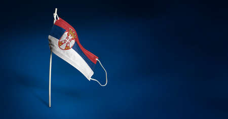 Serbia mask on dark blue background. Waving flag of Serbia painted on medical mask on pole. Virus Attack flag.