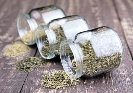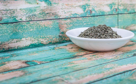Heap of Dried Basil Flakes Over Rustic Wooden Background with Copy Space