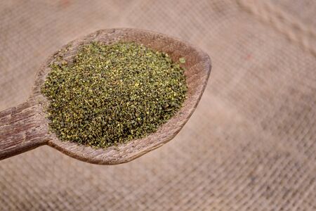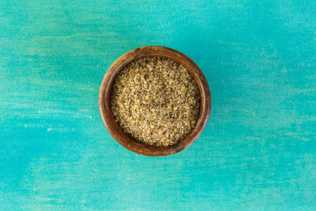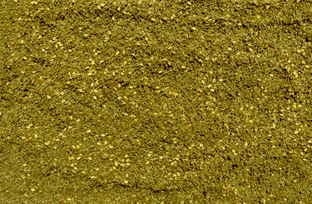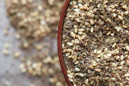 Original Israel and Arabic Za'atar spice. Background made of middle eastern traditional spice mixture zaatar. Top view