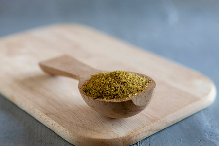 Za'atar (zatar), Middle Eastern spice mixture in wooden bowl