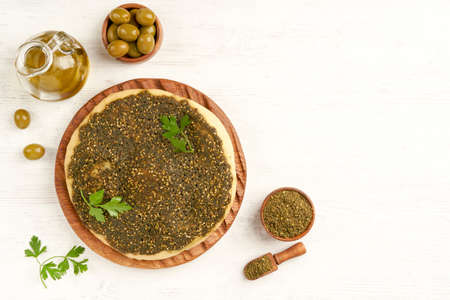 Zaatar manakeesh on wooden board with olives and olive oil. Top view with copy space