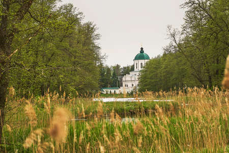 Beautiful landscape with the famous Church in Russia, Konstantinovo, the birthplace of Sergei Yesenin. Russian landmark. A horizontal frame.