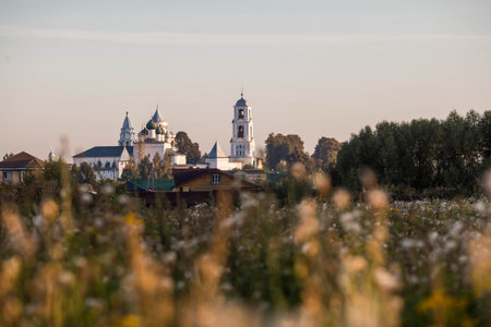 Russia. Pereslavl-Zalessky. Nikitsky Monastery and the bell tower of the Church of the Nativity of the Blessed Virgin Mary in the village of Gorodishche. September, early morning.