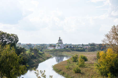 Panorama of Suzdal by the river. Epiphany Church, bell tower of the Monastery of the Holy Sacrament, Russian architecture of the XVIII-XIX centuries. Russia, 2022