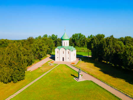 Aerial drone view of the church of Elijah the Prophet at the Kamenka river, Russia. Summer sunny day sunset.