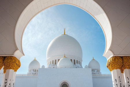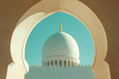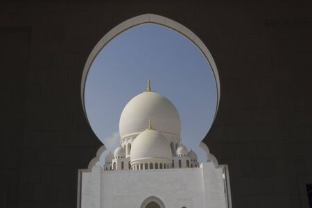 Grand Mosque in Abu Dhabi, with a white dome visible through an archway, against a blue sky background