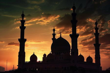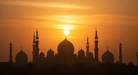 A mosque's iconic domes and minarets are silhouetted against a warm, glowing sunset, creating a breathtaking and serene scene.