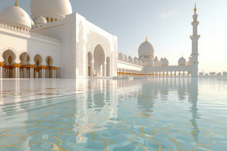 Majestic mosque with intricate architecture reflecting on water under a clear blue sky