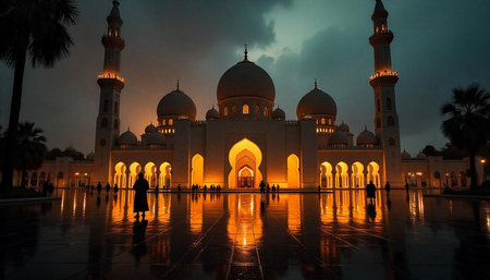 Grand mosque reflecting on wet pavement at dusk twilight