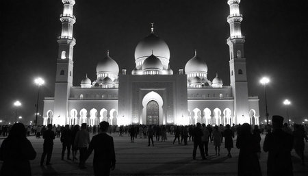 Grand mosque illuminated at night with crowd of people