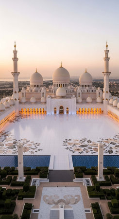 Grand mosque exterior reflecting lights on ground at twilight