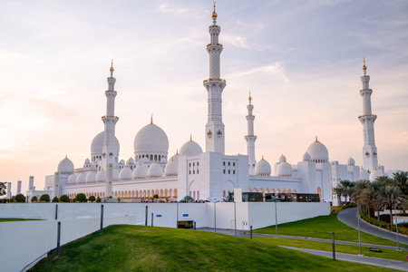 Sheikh Zayed Grand Mosque at sunset, Abu Dhabi, United Arab Emirates. Country's largest mosque, key place of worship for daily Islamic prayers.