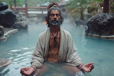 A man is seated in the middle of a body of water. This image can be used to depict solitude, relaxation, or meditation in a natural setting.