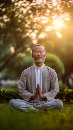 an elderly Japanese man meditating in prayer: He sits peacefully with closed eyes and hands resting on his knees on a green studio background
