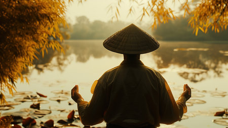 Silhouette of a monk in meditation by a peaceful lake, with the golden hues of dawn reflecting in the water and a serene natural setting.