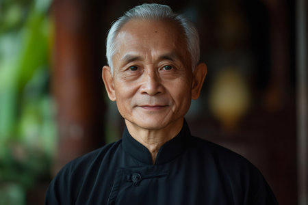 Headshot of confident mature chef wearing black uniform, representing Asian culinary expertise and tradition