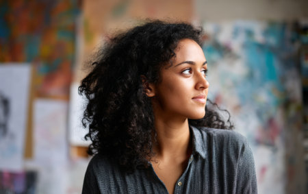 A striking black and white portrait of a woman with curly hair, showcasing her deep thoughts and contemplative emotions. A moment of introspection.