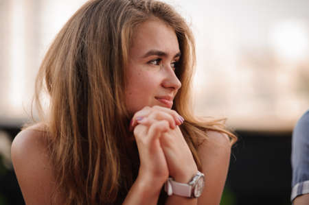 Portrait of a girl. A woman with long hair walks down the street. Beautiful brunette.
