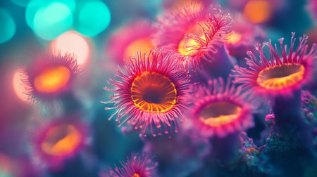 Close-up of a colorful coral polyp, showcasing its intricate structure and glowing orange and white tentacles against a dark background.