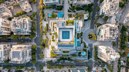 Sunset skyline over urban cityscape with high-rise buildings and distant mountains under golden sky
